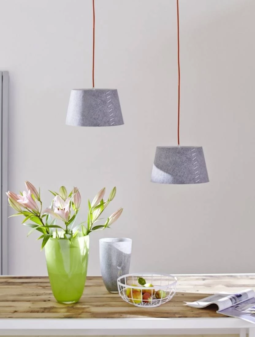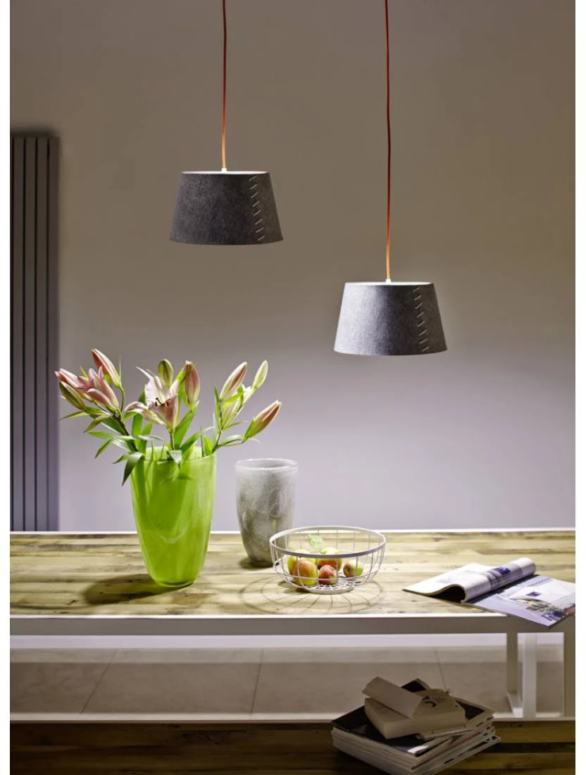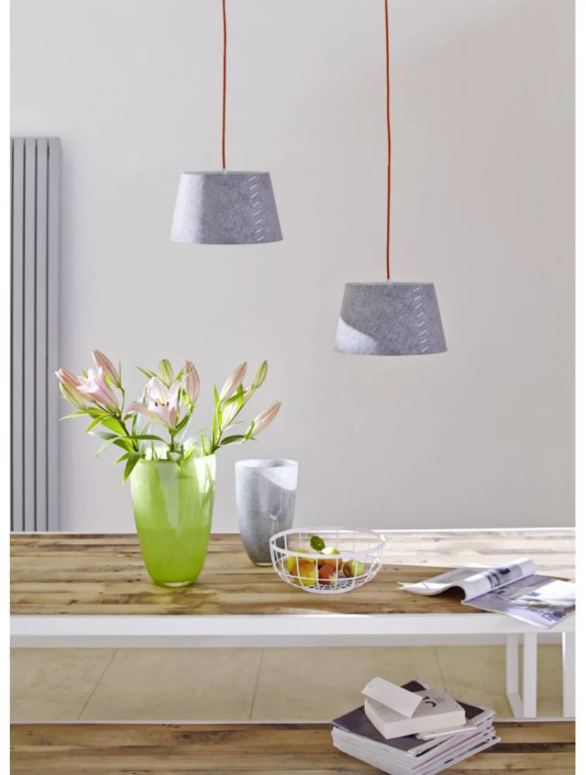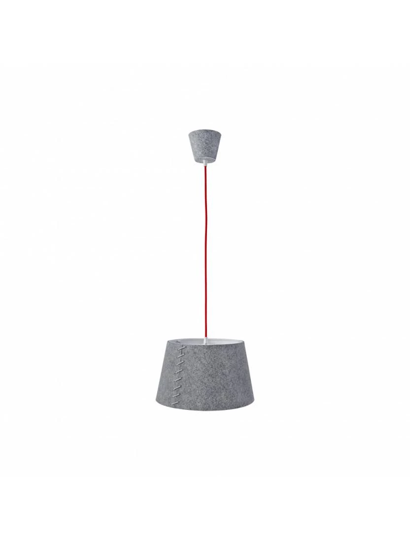 ALICE-riippuvalaisimia saa halkaisijaltaan 30 cm ja 50 cm kokoisina, joten ne sopivat moniin paikkoihin eteisestä lastenhuoneisiin, makuuhuoneista ruokapöytien ylle. Punainen johto tuo klassiseen harmaaseen huopaan modernia leikkisyyttä. Upea kokonaisuus!