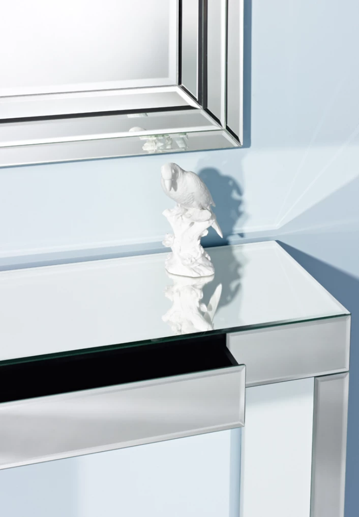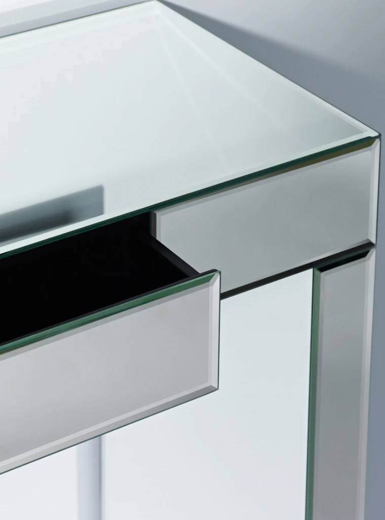 Upea peililasinen konsolipöytä Deknudt Mirrorsilta. Kuten valmistajan nimestäkin voinee päätellä, on tämä upea pöytä pinnoitettu lähes kokonaan peililasilla. Huom. takaosa on mustaa mdf:ää, joten siellä ei peililasia ole. Pöydän etulevyssä on avattava laatikko, jonka sisämitta on noin 57 x 25 cm.