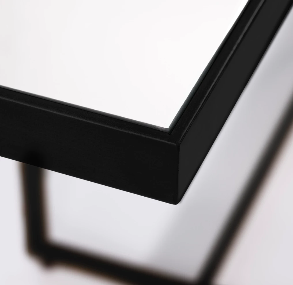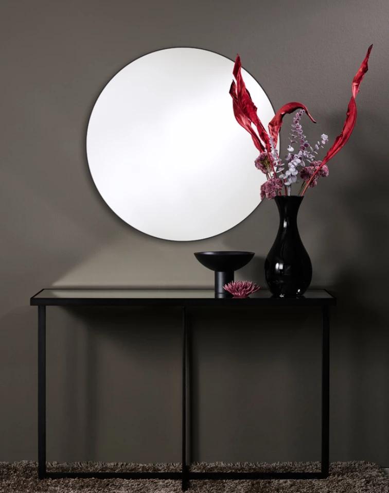 Upea musta konsolipöytä Deknudt Mirrorsilta. Pöydän kansi on peililasia.