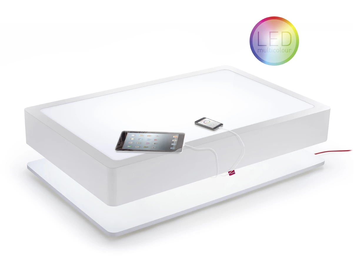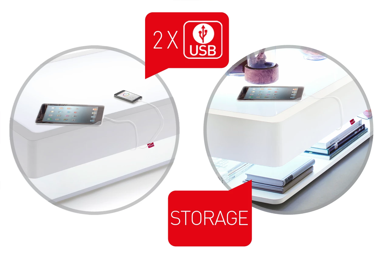 Huikean hieno ja moderni sohvapöytä, jos haluat jotain erilaista. Valmistaja saksalainen Moree. Tuotteesta löytyy myös versio, joka on pelkkä pöytä, ilman led-valoja. Varustettu kaukosäädöllä sekä mm. kahdella usb-liitännällä mobiililaitteiden lataamiseksi.