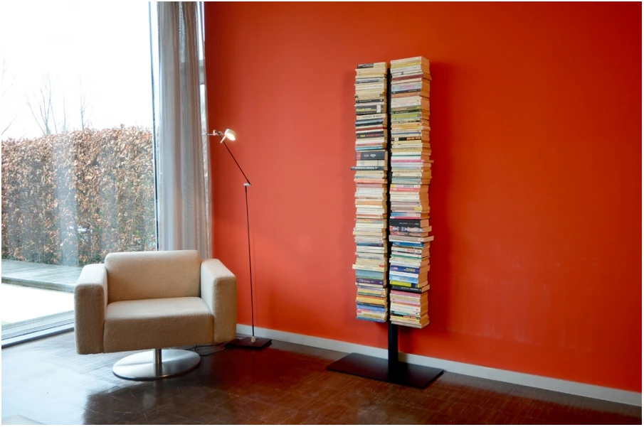 Booksbaum 1 – perhe koostuu lattialla seisovista, tukevista metallihyllyistä, väri- ja kokovaihtoehtoja on useita.