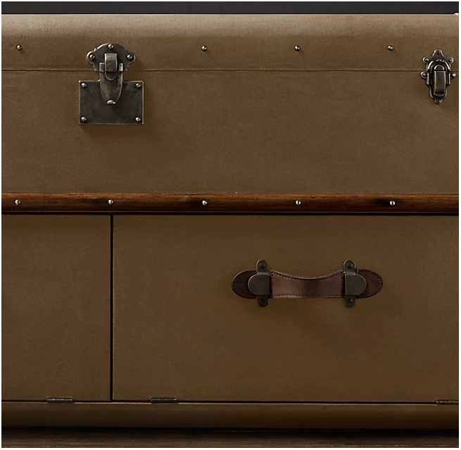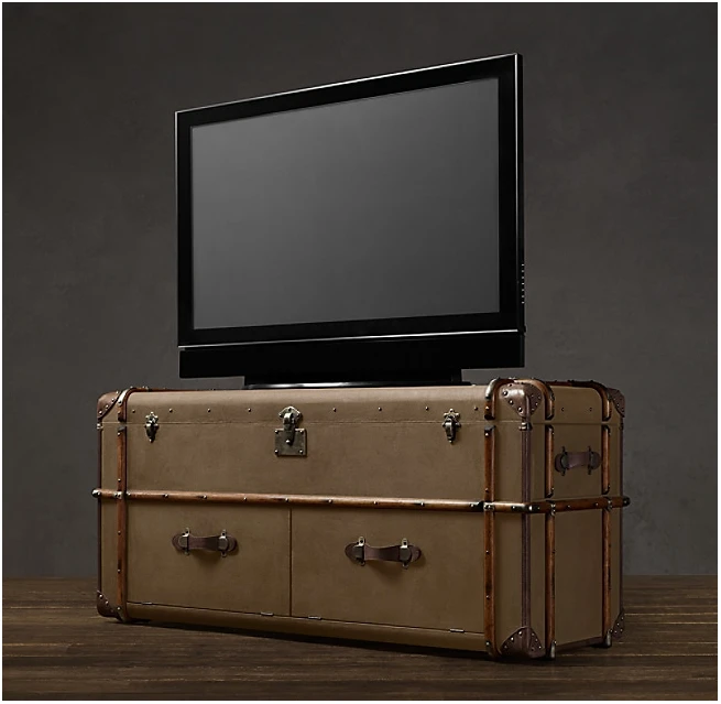 Vanhasta matka-arkusta on muodostunut tyylikäs tv-taso. Se on täynnä lukemattomia yksityiskohtia ja verhoiltukin kankaalla. Sitä saa myös useassa värissä, joten tilaa omasi heti.